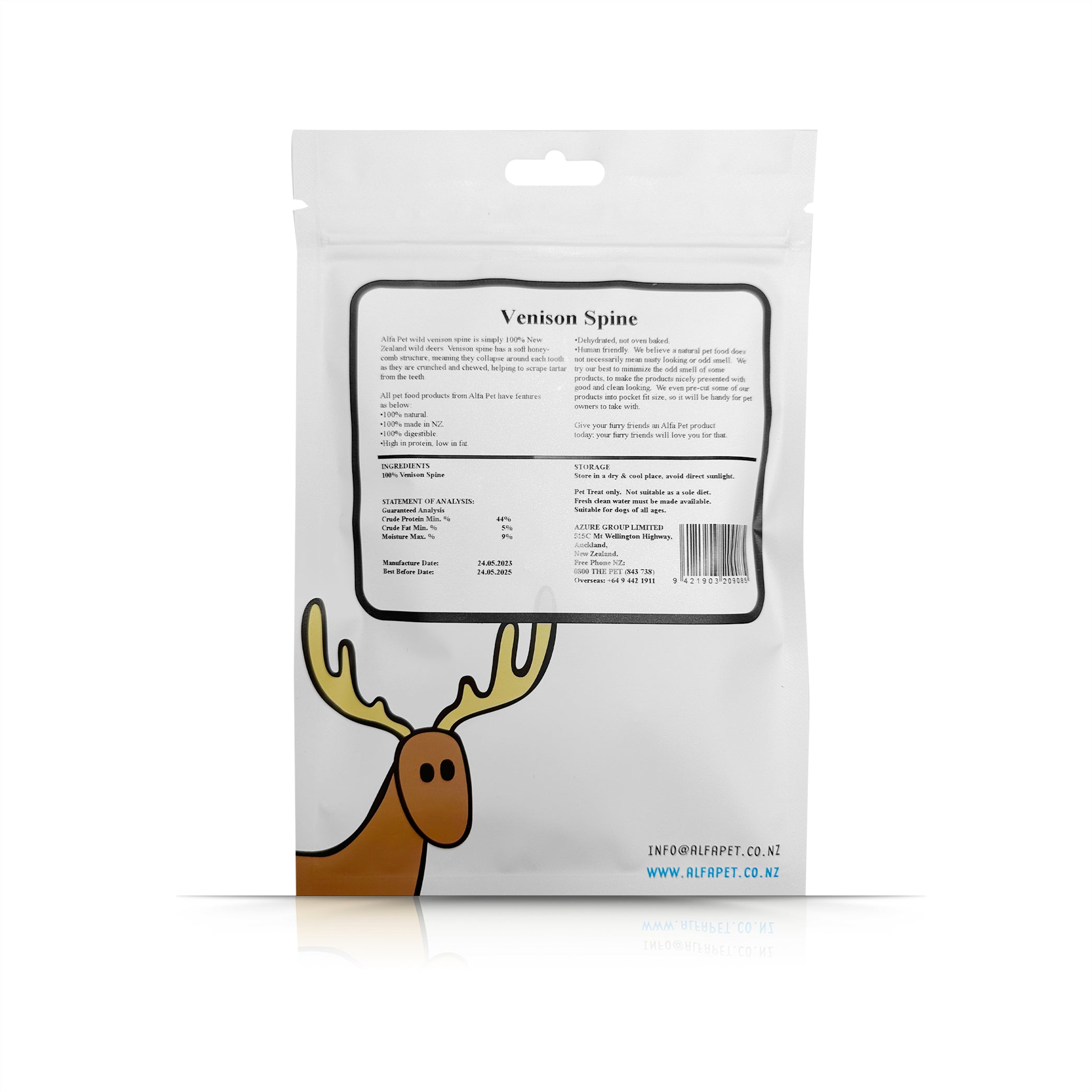 Our Alfa Pet Venison Spine is simply 100% New Zealand wild deer. Venison Spine has a soft honey-comb structure, meaning they collapse around each tooth as they are crunched and chewed, helping to scrape tartar from the teeth.